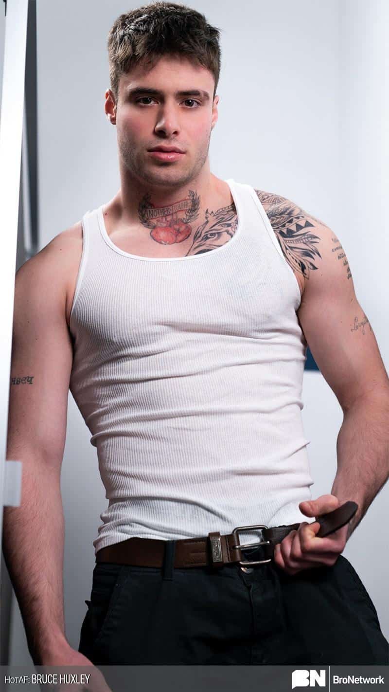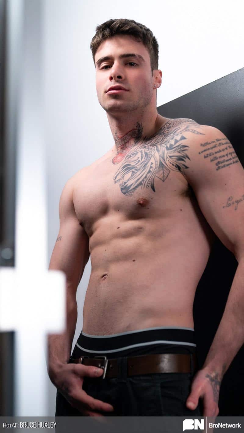 Hot tattooed young muscle boy Bruce Huxley strips naked jerking his huge thick dick