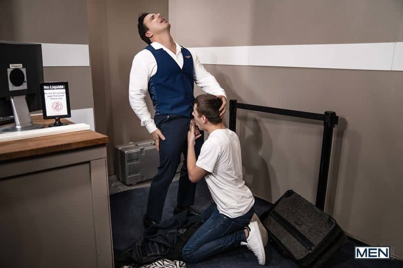 Men.com says: Its panic stations at the airport as sexy young twink Joey Mills and his ‘girlfriend’ rush up to the gate to be met by horny ripped hunk Reese Rideout the always smiling customer service agent.